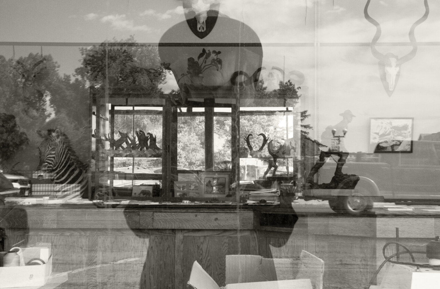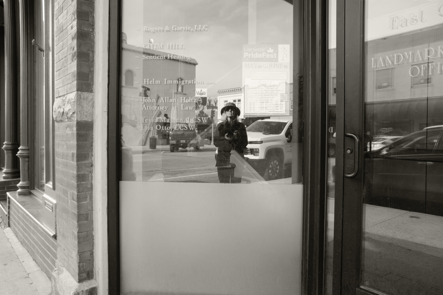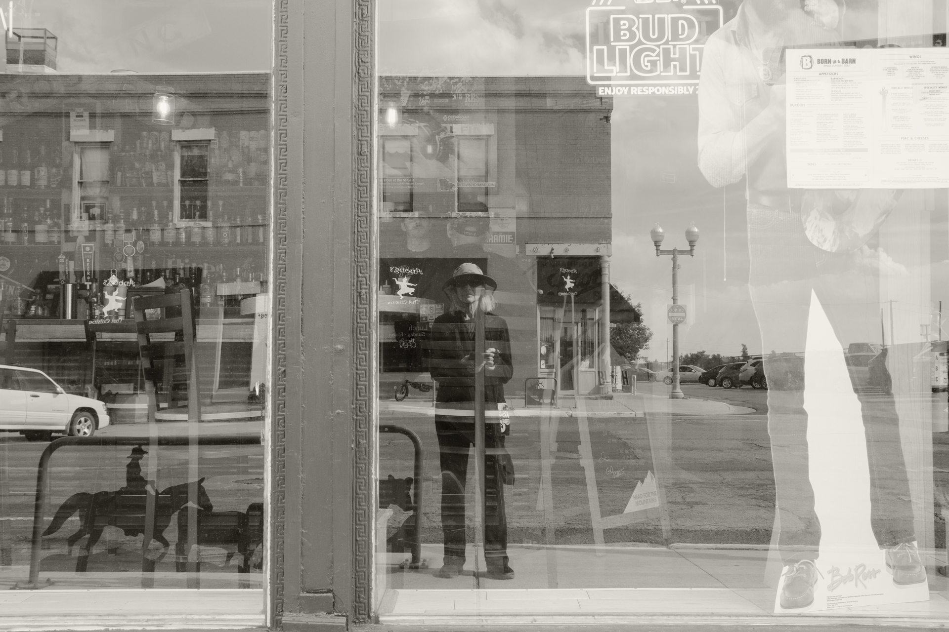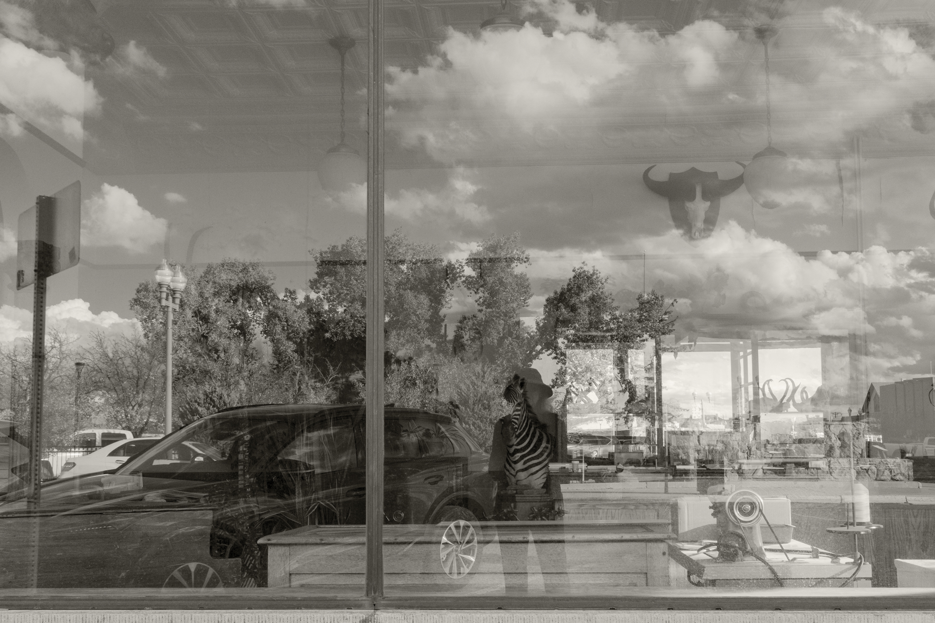 Reflections is an exploration of the historic downtown area of Laramie, WY, where I have lived for over 30 years. I began using self-reflections in Laramie’s storefront windows as an exploration of this very familiar place; it conjures up some broader ideas about how Laramie expresses itself through its vernacular architecture, western iconography, and Old West mythology. I am interested in the complexity of the reflected image, making order from the complicated scenarios one encounters on the street, and creating new narratives through this familiar location.