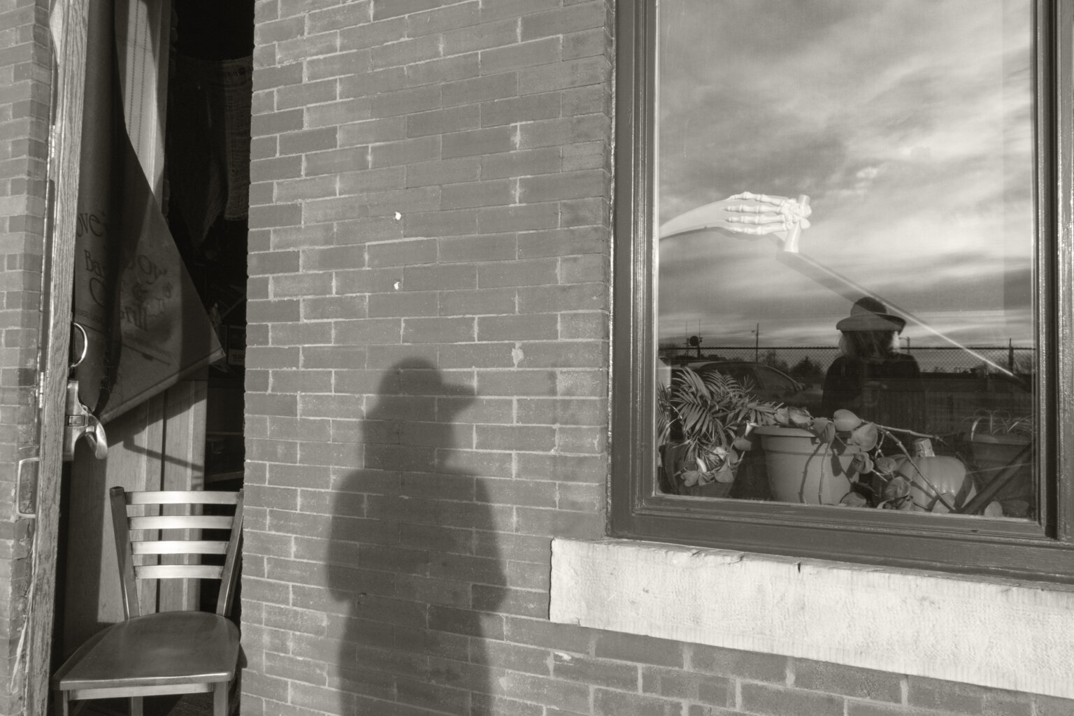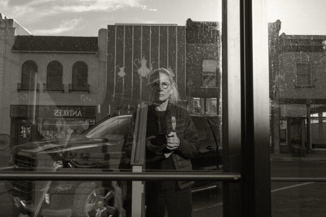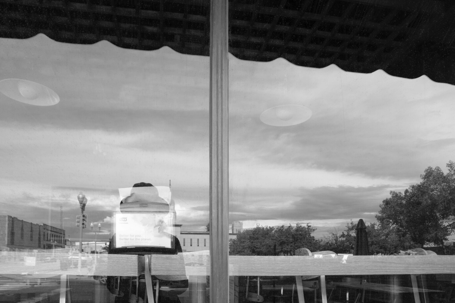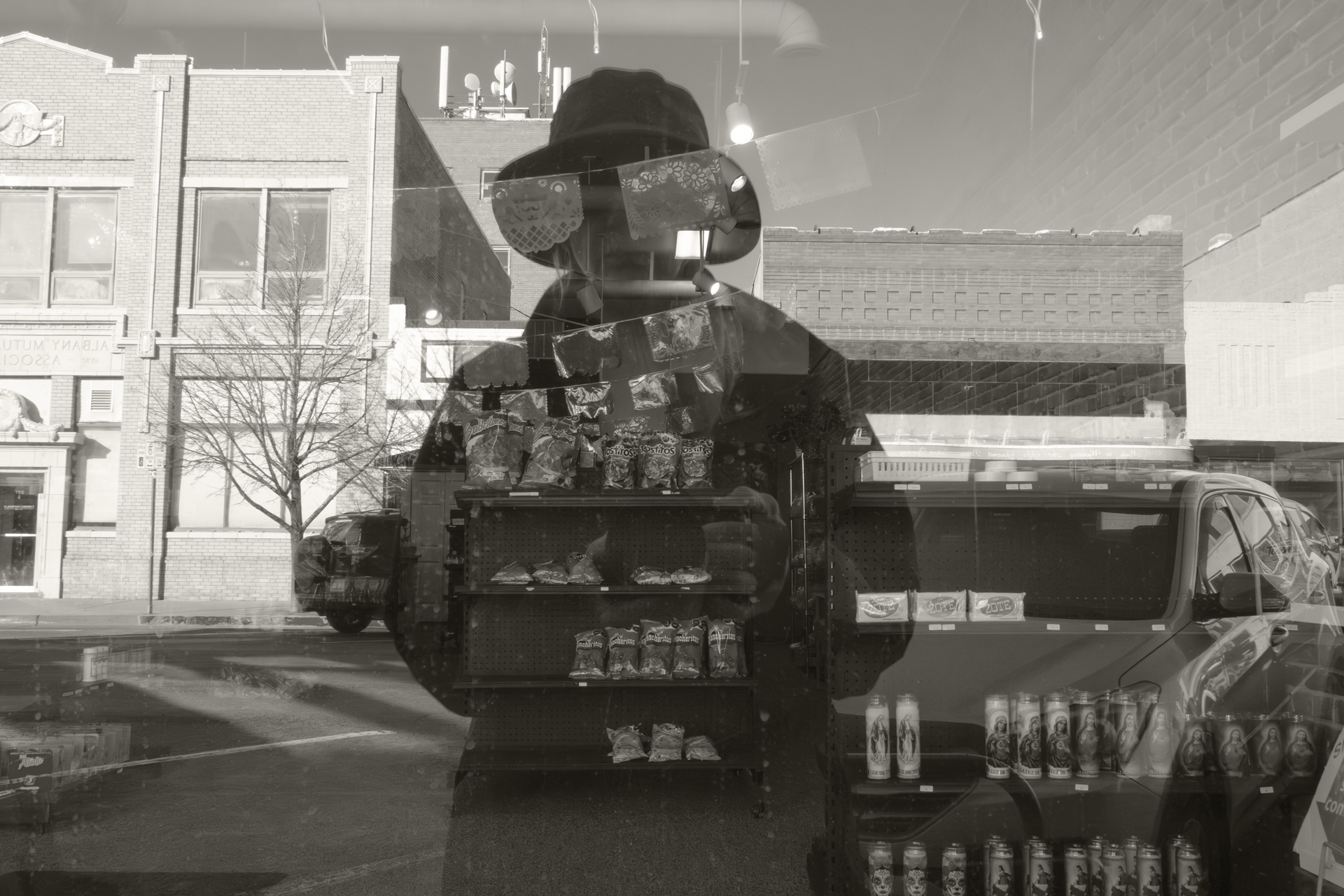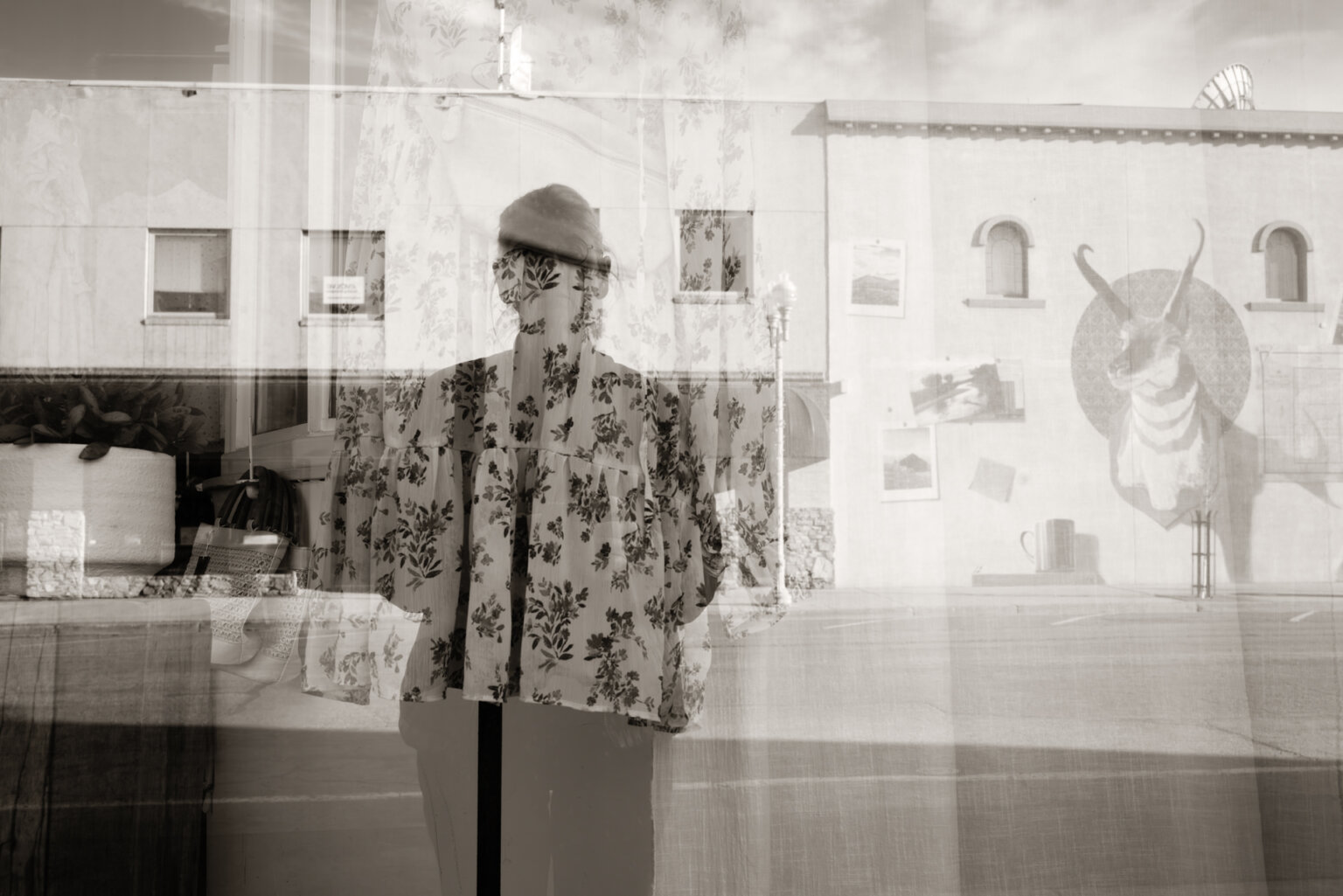Reflections is an exploration of the historic downtown area of Laramie, WY, where I have lived for over 30 years. I began using self-reflections in Laramie’s storefront windows as an exploration of this very familiar place; it conjures up some broader ideas about how Laramie expresses itself through its vernacular architecture, western iconography, and Old West mythology. I am interested in the complexity of the reflected image, making order from the complicated scenarios one encounters on the street, and creating new narratives through this familiar location.
