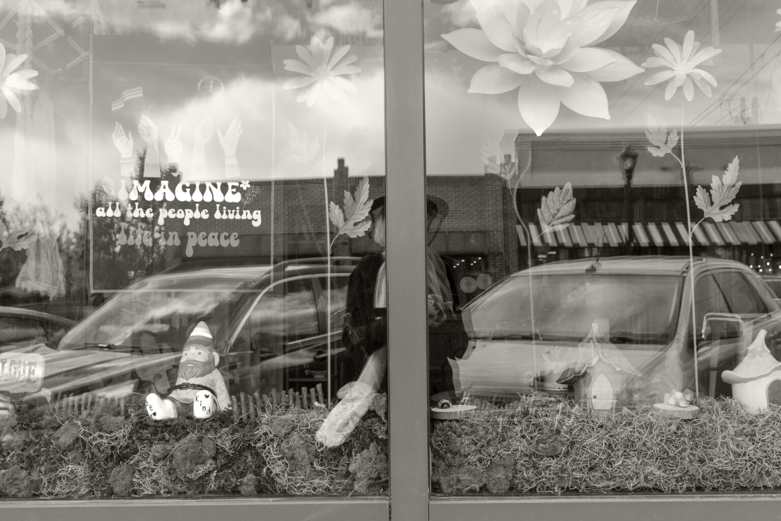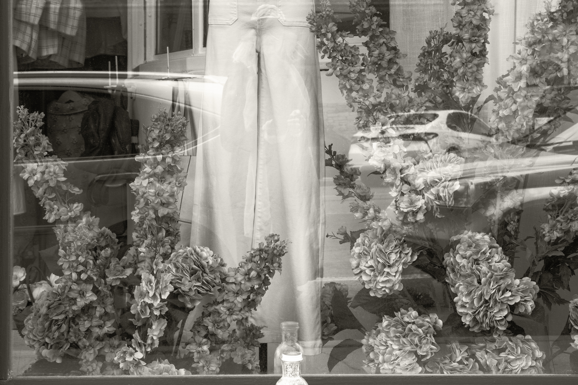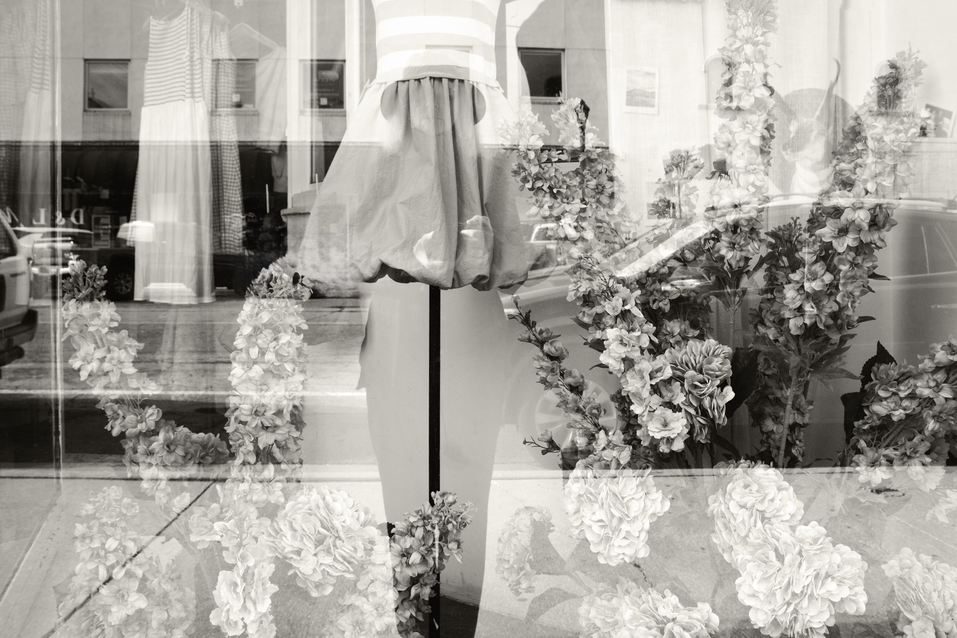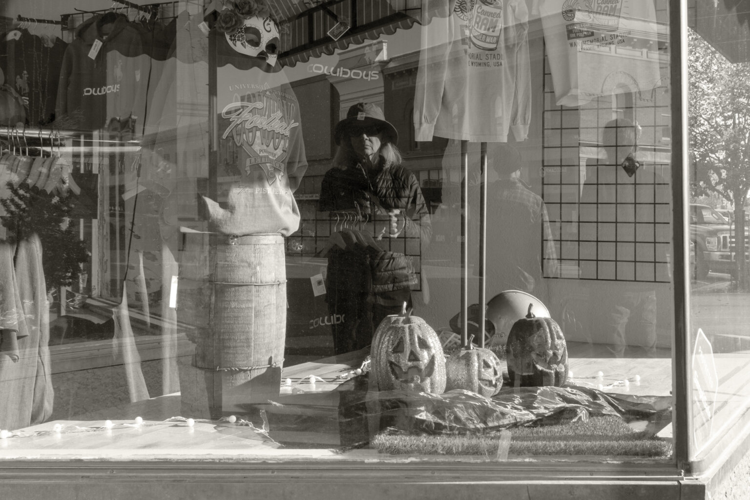 Reflections is an exploration of the historic downtown area of Laramie, WY, where I have lived for over 30 years. I began using self-reflections in Laramie’s storefront windows as an exploration of this very familiar place; it conjures up some broader ideas about how Laramie expresses itself through its vernacular architecture, western iconography, and Old West mythology. I am interested in the complexity of the reflected image, making order from the complicated scenarios one encounters on the street, and creating new narratives through this familiar location.